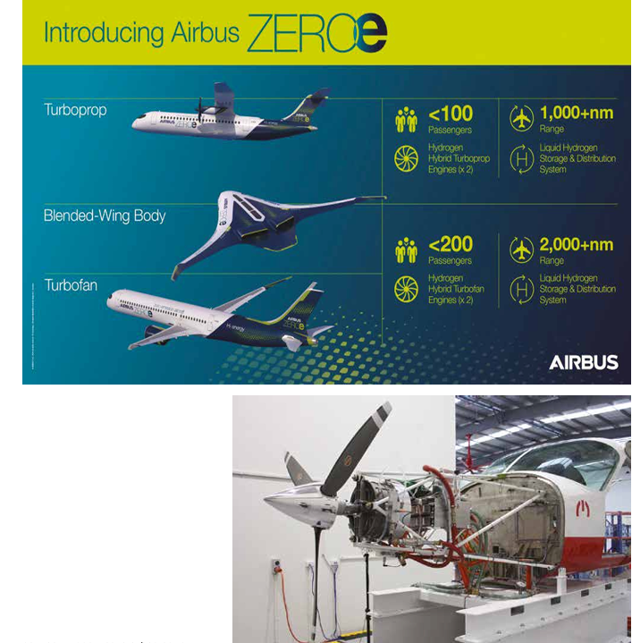 Turboprop aircraft (up to 100 passengers): Will have two hybrid hydrogen turboprop engines driving eight-bladed propellers providing thrust, capable of short-haul journeys with a range of 1,000 nautical miles. The liquid hydrogen storage and distribution system will be located behind the rear pressure bulkhead.