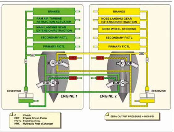 In twin-engine aircraft, each engine has a pump that supplies flow and pressure to the hydraulic power system. These are the main pumps or engine-driven pumps. They are usually variable displacement pumps, which adjust flow and pressure without needing a pressure regulator. A large-diameter supply line, pressurized reservoir, and minimal components between the reservoir and pump (except fire shutoff valve) are essential for proper supply.