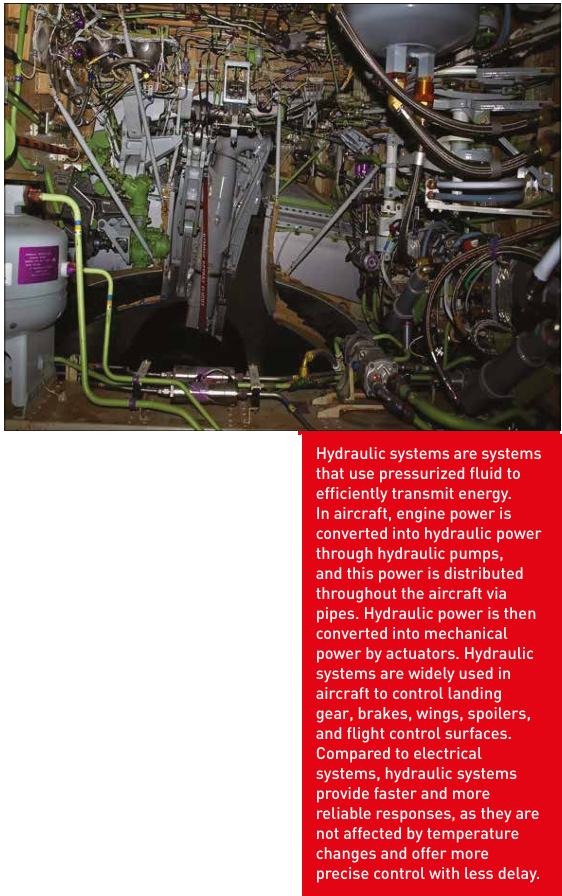 In aircraft, hydraulic systems are systems that use pressurized fluids to efficiently transmit energy. These systems draw power from the engines and convert it into hydraulic energy. Hydraulic systems are used to control various aircraft functions, including landing gear, brakes, wings, spoilers, and flight control surfaces.