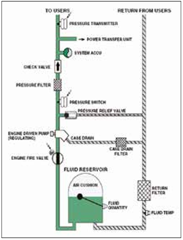 Pumps pressurize the hydraulic fluid. Generally, there are three types of pumps in a hydraulic system: Engine Driven Pumps (EDP), Electric Motor Pumps (EMP), and Hand Pumps.