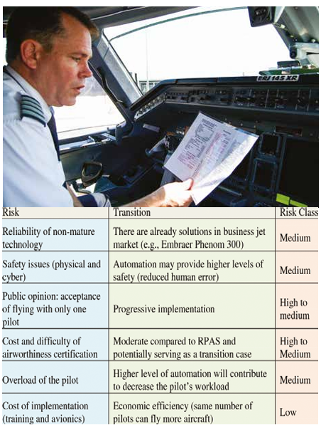 Various technological approaches are being explored for the development of a single pilot aircraft. Some focus upon the development of much increased levels of automation (for example, intelligent knowledge-based systems, autonomous systems and adaptive automation). Other approaches adopt a more technologically-cautious approach to using a large amount of on-board computing. These use a distributed systems-based design philosophy, utilising a great deal of extant technology derived from single seater military aircraft and UAS (Uninhabited Aviation Systems) technology. It would be inappropriate to characterise these approaches as ‘either/or’ options: there is a great deal of commonality in the technologies to be developed and the operational challenges that airline operators would face. However, it is useful to characterise the approaches to developing a single crew aircraft in this way to illustrate the unique advantages and challenges faced by each technological strategy.