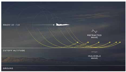The XB-1’s design allows it to break the sound barrier at altitudes above 30,000 feet (9,144 meters). This altitude is where the principle known as Mach cutoff physics becomes relevant. When an aircraft (or any object) exceeds the speed of sound, it generates a shockwave that moves outward and downward. However, when flying above the Mach cutoff boundary at around 30,000 feet, these shockwaves are directed upward into the atmosphere, not downward toward populated areas enabling quieter flight.