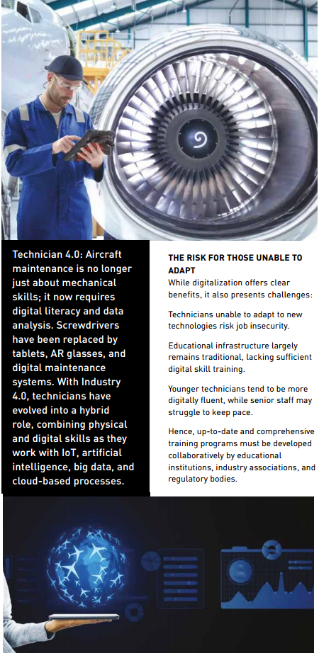 As aviation technology becomes increasingly complex, the safe operation of aircraft remains fundamentally reliant on human expertise. Machines can collect data and issue early warnings, but effective intervention and decision-making depend on skilled human technicians. The “Technician 4.0” concept embodies a new maintenance culture that integrates technology with human intellect and experience. This culture not only uses technology but understands it and places the human element at the center of operations. Digitalization transforms the technician’s role from a passive data entry operator to an active decision-maker.