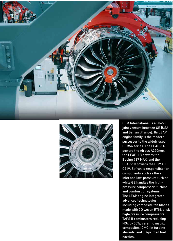 CFM International, a 50–50 joint venture between GE and Safran, developed the LEAP engine as a modern successor to the CFM56 series. The LEAP-1A, -1B, and -1C power the Airbus A320neo, Boeing 737 MAX, and COMAC C919, respectively. Featuring advanced technologies such as composite fan blades, blisk compressors, TAPS II combustors, CMC materials, and 3D-printed fuel nozzles, the LEAP engine is 226 kg lighter, 15% more fuel-efficient, and significantly cleaner and more durable, offering faster 25-minute turnaround times.