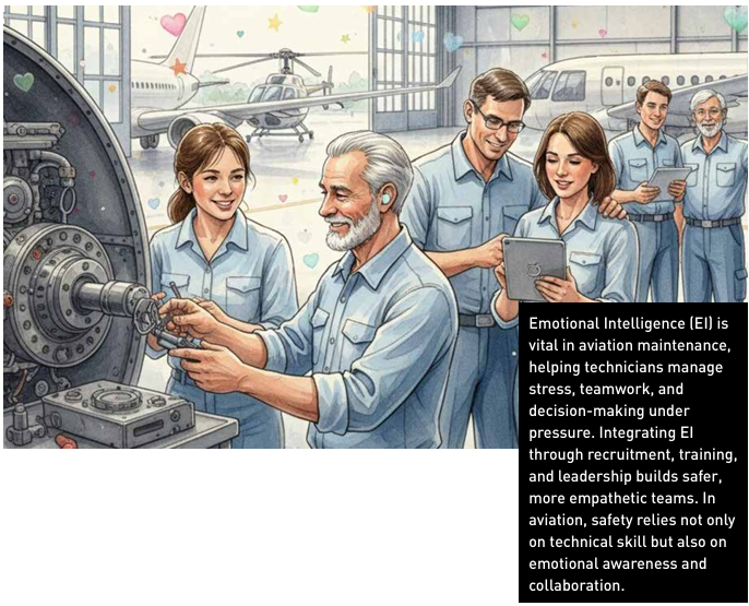 In aviation maintenance, technical skill keeps aircraft flying but emotional intelligence (EI) keeps them safe. By fostering self-awareness, self-management, social awareness, and relationship management, EI helps technicians manage stress, communicate effectively, and prevent the human errors behind most incidents. An emotionally intelligent AMT is not just a mechanic, but a guardian of safety and teamwork, blending precision with empathy.